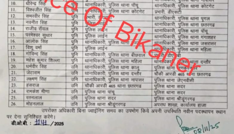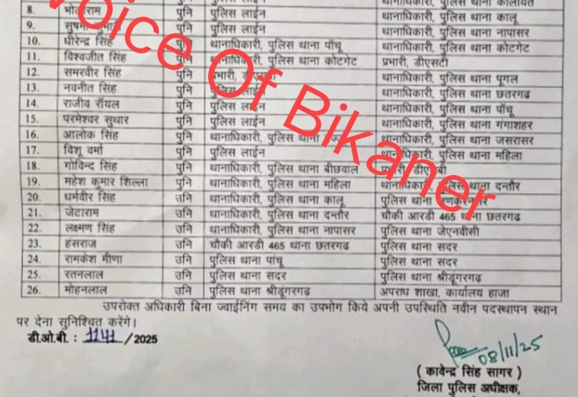बीकानेर : एसपी कावेंद्र सिंह सागर ने सीआई की तबादला सूची जारी की, देखें लिस्ट