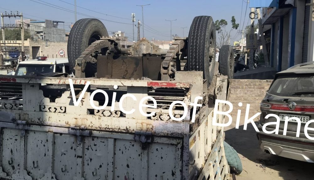 बीकानेर: घर के आगे खड़ी कार से टकराकर सड़क पर पलटी अनियंत्रित पिकअप, मचा हड़कंप